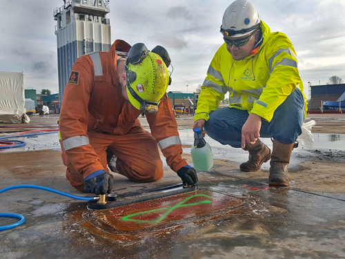 ‘Vacuum box bubble testing’ is een veilige en betrouwbare NDT-methode om lasnaden van opslagtanks te testen op lekkages. Een vacuümpomp en een sopoplossing worden gebruikt: bij lekkage ontstaan er bellen.